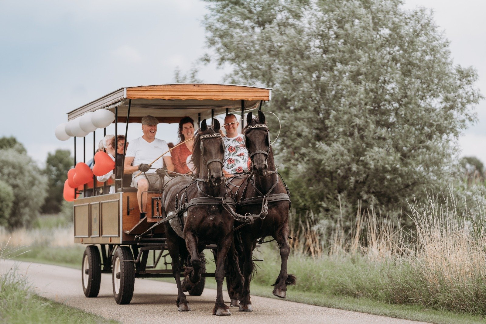 Met de prachtige Friese paarden, die normaal rustig in de wei grazen, rijdt Evert vol enthousiasme rond en dat plezier straalt af op mensen én dier. Er is een mooie route uitgestippeld richting Vorden, waarbij u onderweg kunt genieten van het landschap en een gezellig drankje. De Jan Plezier rijdt bij een groep vanaf 10 tot maximaal 16 personen en de rit duurt ongeveer anderhalf uur. Informeer gerust naar de mogelijkheden.